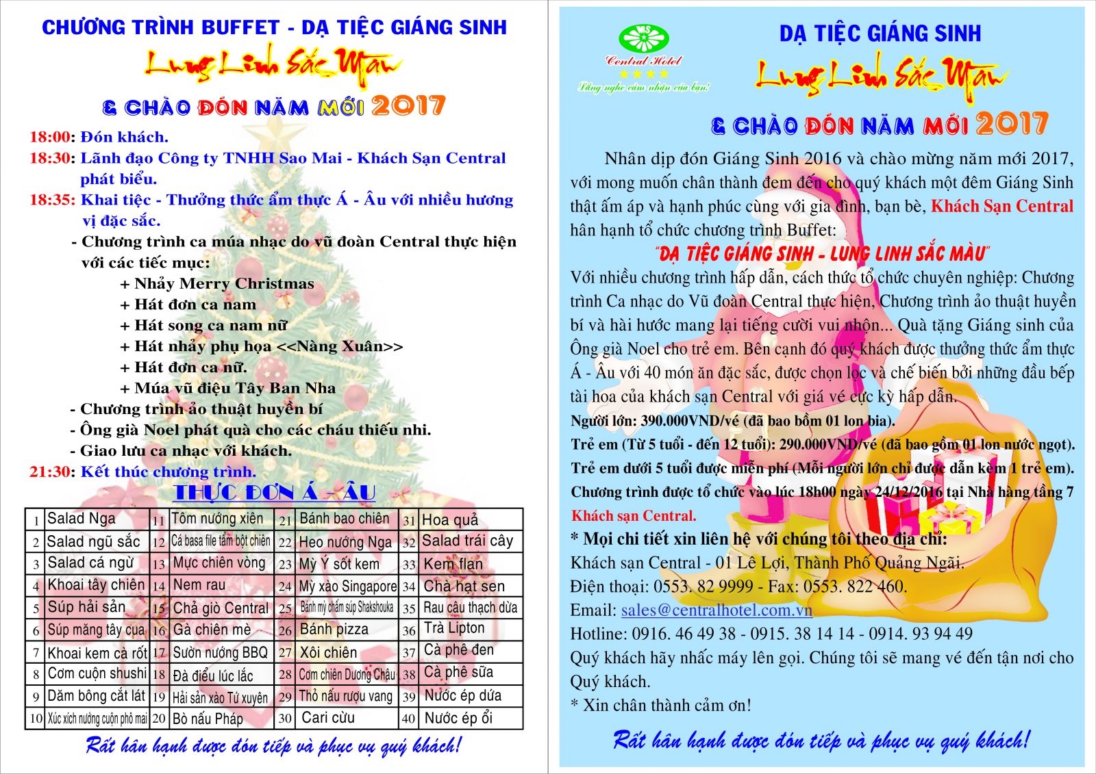 Nhân dịp đón Giáng sinh 2016 và chào mừng năm mới 2017, với mong muốn chân thành đem đến cho quý khách một đêm Giáng sinh thật ấm áp và hạnh phúc cùng với gia đình, bạn bè, Khách sạn Central hân hạnh tổ chức chương trình Buffet: “DẠ TIỆC GIÁNG SINH - LUNG LINH SẮC MÀU” với nhiều chương trình hấp dẫn, cách thức tổ chức chuyên nghiệp: Chương trình ca nhạc do Vũ đoàn Central thực hiện, Chương trình ảo thuật huyền bí và hài hước mang lại tiếng cười vui nhộn... Quà tặng Giáng sinh của Ông già Noel cho trẻ em. Bên cạnh đó, Quý khách được thưởng thức ẩm thực Á - Âu với 40 món ăn đặc sắc được chọn lọc và chế biến bởi những đầu bếp tài hoa của khách sạn Central với giá vé cực kỳ hấp dẫn: